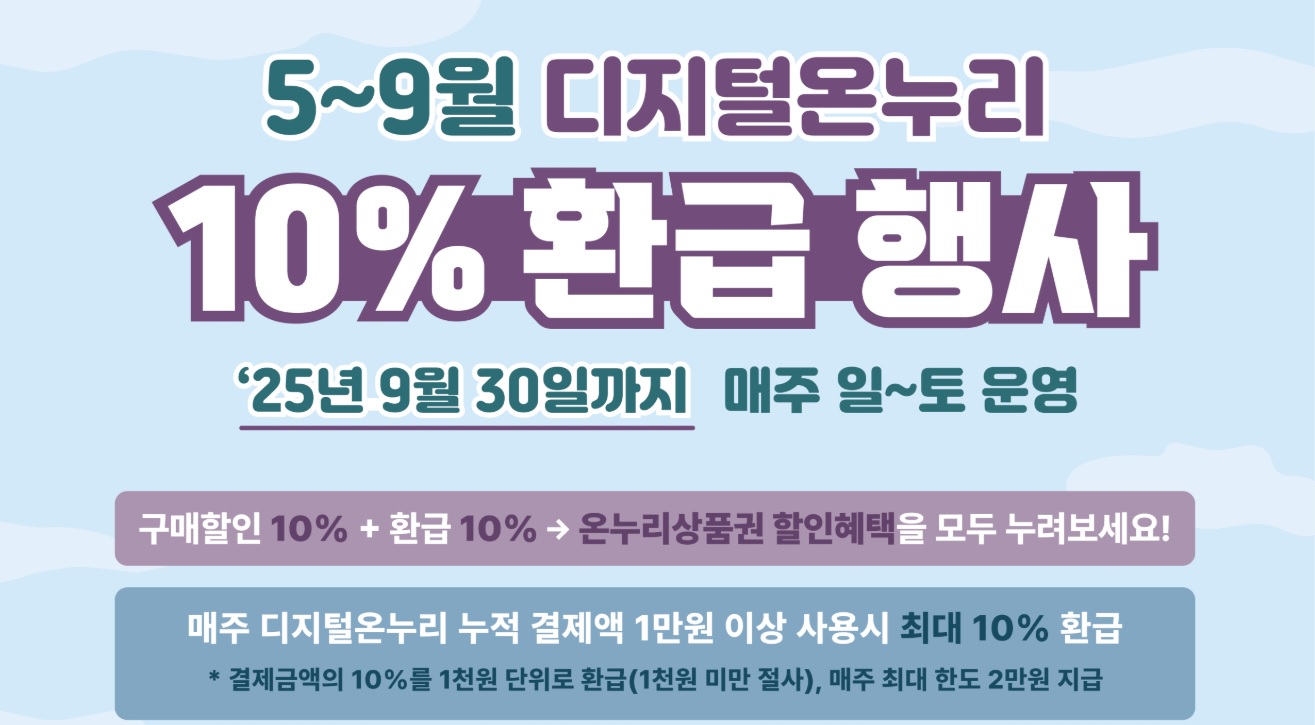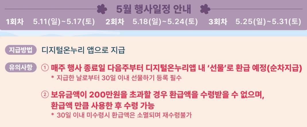 ✔ 10% 환급: 디지털 온누리 상품권으로 결제한 금액의 10%를 디지털 상품권으로 환급합니다. 매주 누적 결제액이 1만원 이상일 경우에 적용되며, 매주 일요일~토요일까지 사용한 금액을 매주 정산하는 방식으로 이루어집니다. 예를 들어, 5월 18일(일)~5월 24일(토) 까지의 누적 사용액이 10만원이라면, 1만원을 디지털온누리 앱 내 '선물' 로 환급합니다. 다만 지급한 날부터 30일 이내에 꼭 수령을 눌러야 합니다. 수령하지 않은 환급금은 소멸되니 꼭 참고하시기 바랍니다.